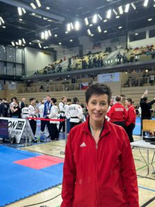 Die German Open 2026 waren für Katja Frauenfelder ein besonderes Erlebnis. Mit 565 Starts aus 32 Ländern der Welt wurde das Turnier erstmals als G1-Weltranglistenturnier ausgetragen und war dementsprechend hochkarätig besetzt. Katja schaffte in ihrer Klasse Damen 41-50 Jahre die erste Runde und zog ins Achtelfinale ein. Im Side-by-Side-Modus trat sie dort gegen die griechische Nationalmannschaftsstarterin Maria Eleni Emmanouilidou an. Parallel performten beide Starterinnen die 8. und die 12. Form, welche kurz vorher auf der Fläche angezeigt wurden. Mit 7,184 zu 7,384 Punkten lag Katja am Ende nur 0,2 Punkte hinter der Griechin, ein tolles Ergebnis für die Hünfelderin und am Ende Platz 9 in dem hochkarätig besetzten Teilnehmerfeld.